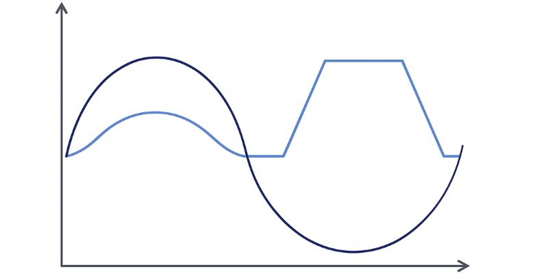 На осциллографе чистая волна отображается как ровная, плавная линия с одинаковыми пиками и впадинами. В отличие от неё, модифицированная форма имеет резкие ступенчатые колебания, при которых ток подаётся рывками и увеличивается нагрузка на оборудование.