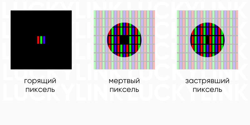«Застрявший» пиксель. Заметен на пестром фоне. Проявляется в неправильном цвете из-за перегрева матрицы монитора. Имеет красный, синий или зеленый цвета. Есть возможность восстановления.