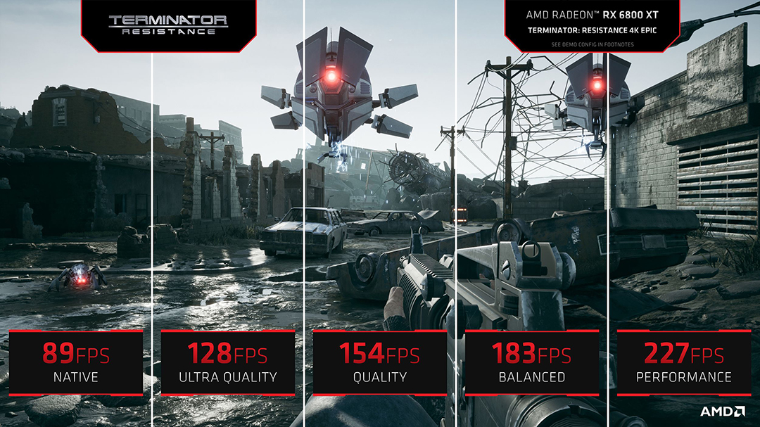 Дебютировавшая в 2020 году вместе с видеокартами AMD Radeon 6000 Series программная разработка FidelityFX Super Resolution основана на принципе временного масштабирования, то есть оптимизации обработки данных движущихся кадров. Если вкратце, то FSR занимается дополнительной обработкой графики, качество рендера которой близко к нативному. К примеру, обладатели Full HD (1080p) мониторов при включенной функции FSR в зависимости от выбранных настроек получают 720-900p изображение, которое программными средствами масштабируется до 1080p с интеллектуальным повышением детализации.