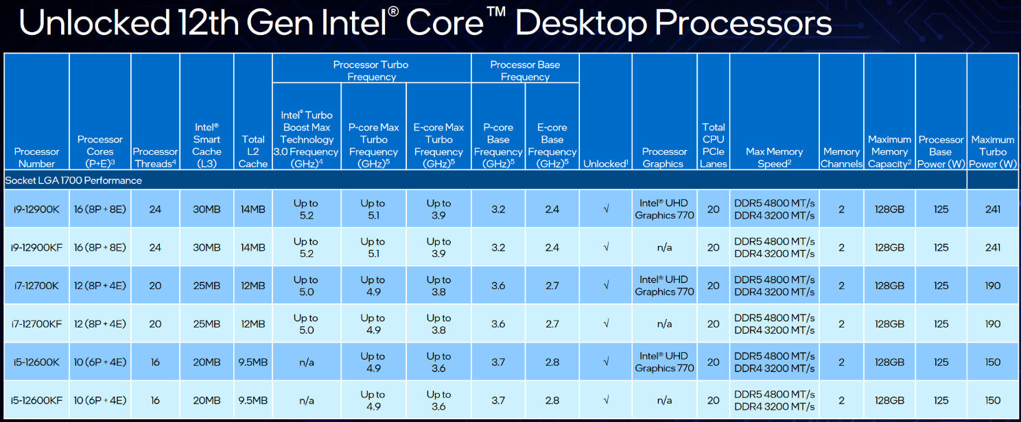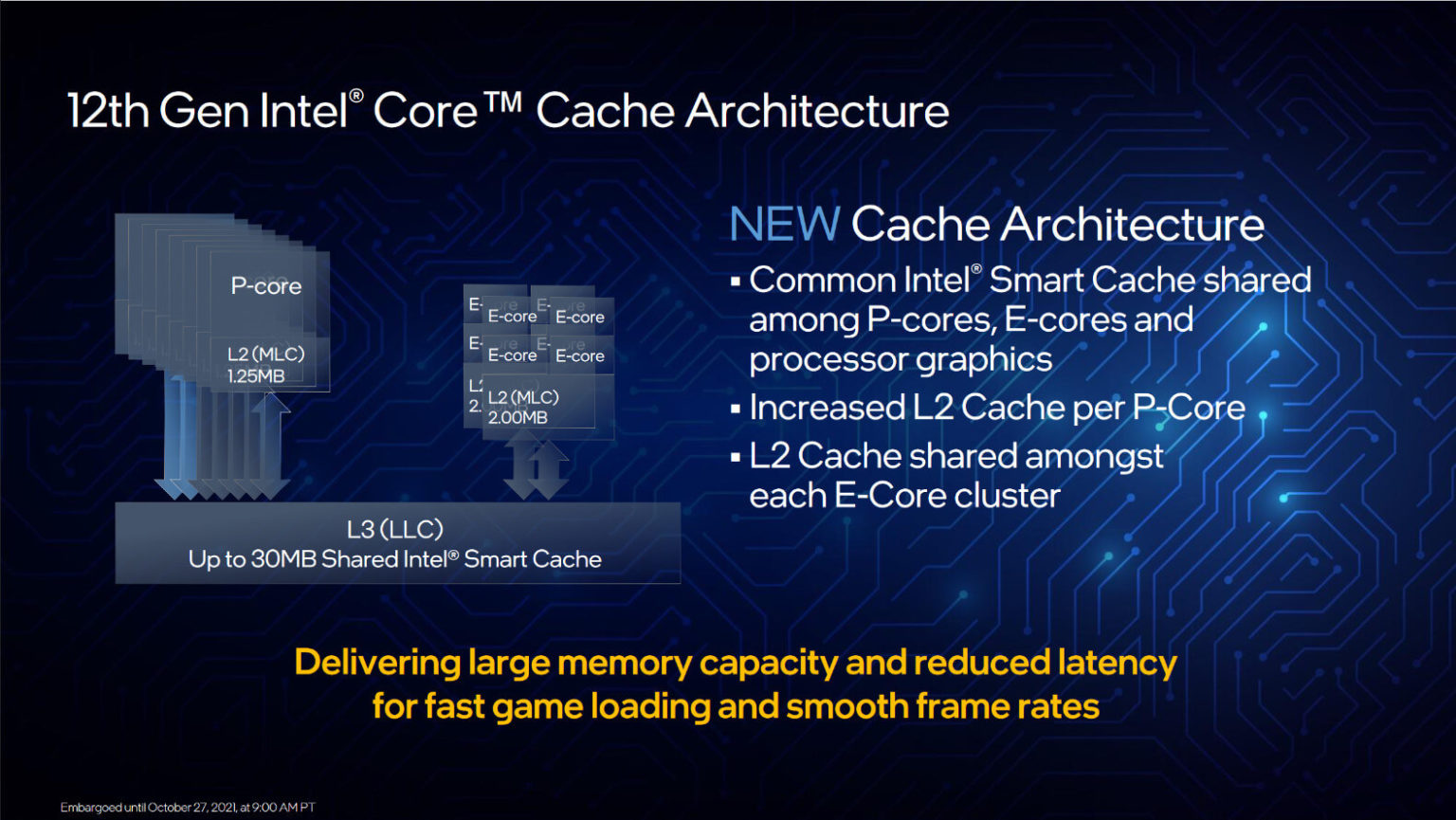 Настольные процессоры Intel произведены при использовании архитектуры с производительными и энергоэффективными ядрами. Этот подход давно используется в мобильных ARM-процессорах, позволяя оптимизировать выполнение операций и снизить энергопотребление. За корректное распределение ресурсов будет отвечать технология Thread Director. Вопрос потребления энергии является ключевым для всего семейства Alder Lake, так как частота большинства флагманских моделей превышает 5 ГГц, а значение TDP достигнет 125 Вт. В составе обновленной модели построения CPU присутствуют мощные P-Cores на архитектуре Golden Cove и энергоэффективные E-Core на архитектуре Gracemont. Для каждого типа ядер предусмотрено расширение L2 кэш памяти (1,25 и 2 MB соответственно) и L3 кэша от 20 до 30 MB. Чистая производительность (IPC) вырастет на 19% в сравнении с Rocke Lake-S, а в некоторых задачах преимущество достигнет 40%. Компания Intel успела заявить о превосходстве Core i9-12900K над конкурентом Ryzen 9 5950X в игровых задачах, однако позже выяснилось, что при тестировании использовалась операционная система Windows 11 без патча, который устраняет проблему снижения скорости вычисления процессоров AMD.