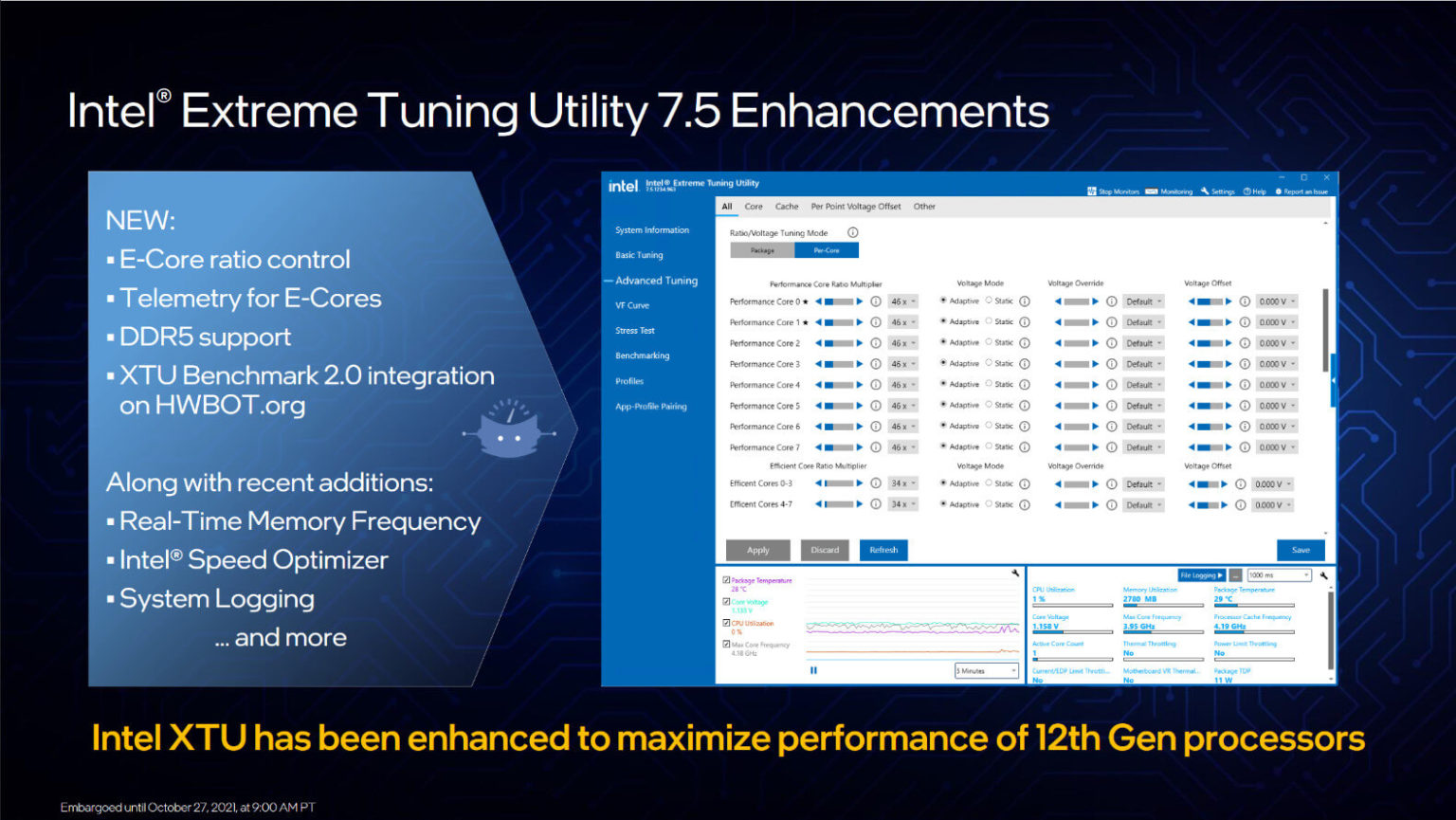 Процессоры Intel семейства Alder Lake дебютируют в ближайшее время эксклюзивно для платформы Z690, которая характеризуется поддержкой оперативной памяти типов DDR5-4800 и DDR4-3200. Более доступные варианты чипсетов дебютируют в первой половине 2022 года. Контроллер платформы Z690 поддерживает 16 линий PCIe 5.0 и 12 линий PCIe 4.0, а физически материнские платы Z690 получат новый разъем - LGA1700, что стал немногим больше для улучшения рассеивания тепла. Для оверклокинга решений с разблокированным множителем и настройки памяти представлена утилита Extreme Tuning Utility, что призвана упростить будни оверклокера. Официальный дебют первых шести моделей Intel 12th Gen состоится уже 5-го ноября при цене от $264 до $589.
