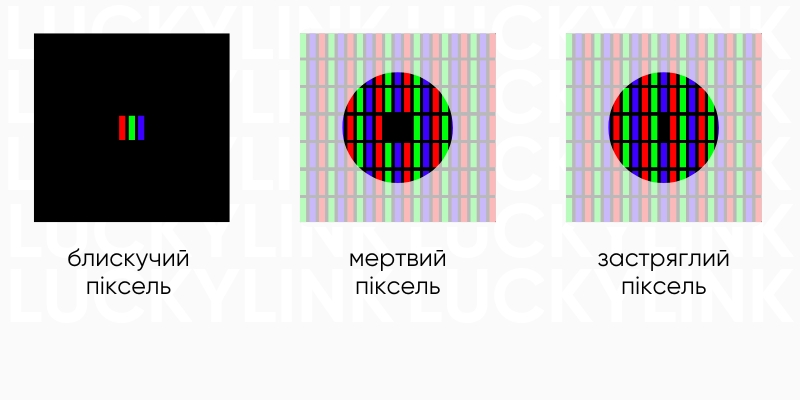 «Блискучий» піксель (або піксель “що горить”). Світлова цятка, проявляється на чорному тлі. Це свідчить про те, що піксель постійно в роботі. Підлягає виправленню.
